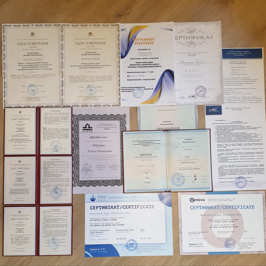 Мои профессии: психолог, SOLWI-терапевт, арт-терапевт (российские дипломы), детский арт-терапевт, педагог.