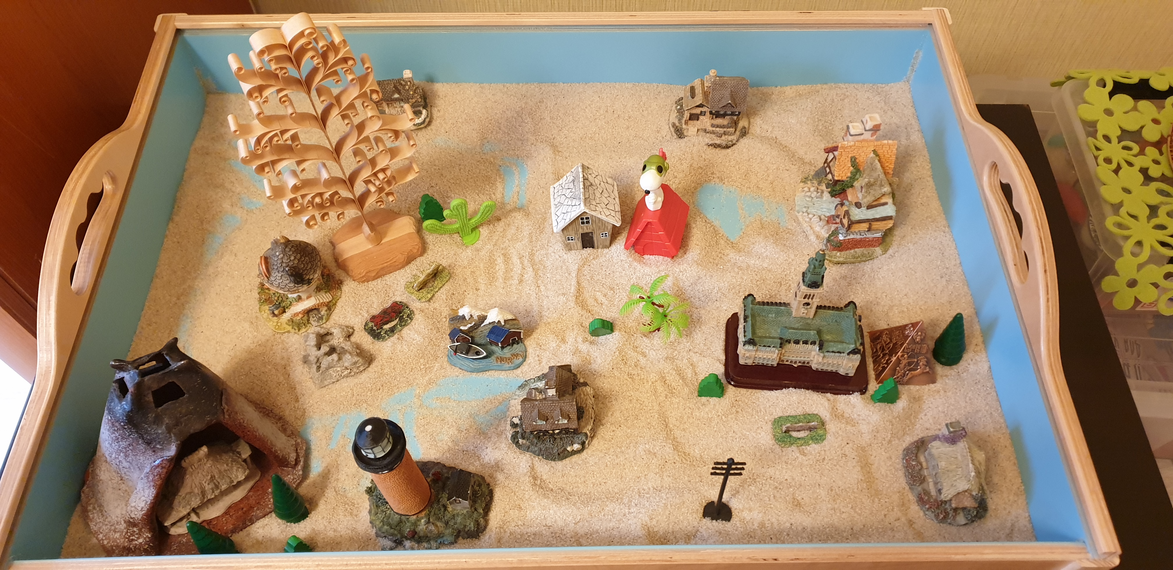 В песочной терапии используется специально созданная деревянная песочница определённого размера с мелким очищенным песком и большое количество разнообразных миниатюр.